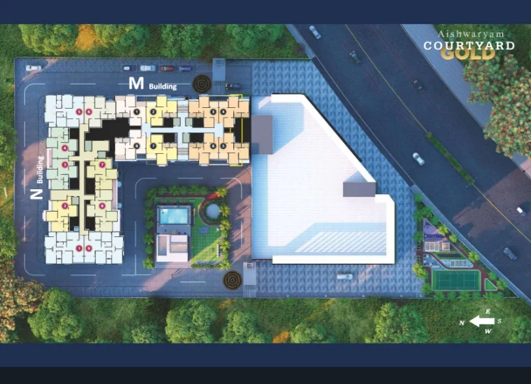 Aishwaryam Courtyard Gold Residential project in Pune offering Apartments for Sale in Moi. The property offers 2&3BHK Apartments meticulously planned that guarantee a hassle-free lifestyle. As per the area plan it is set in 10.04 Acres and has 234 units in the size range 621 – 1059 sq.ft. Possession date is June 2026. Aishwaryam Courtyard Gold offers prices suitable for both luxurious and affordable Apartments in Pune. Aishwaryam Courtyard Gold is located Moi. This is considered as best Apartments for Sale in Pune and best Apartments for Sale in Moi.