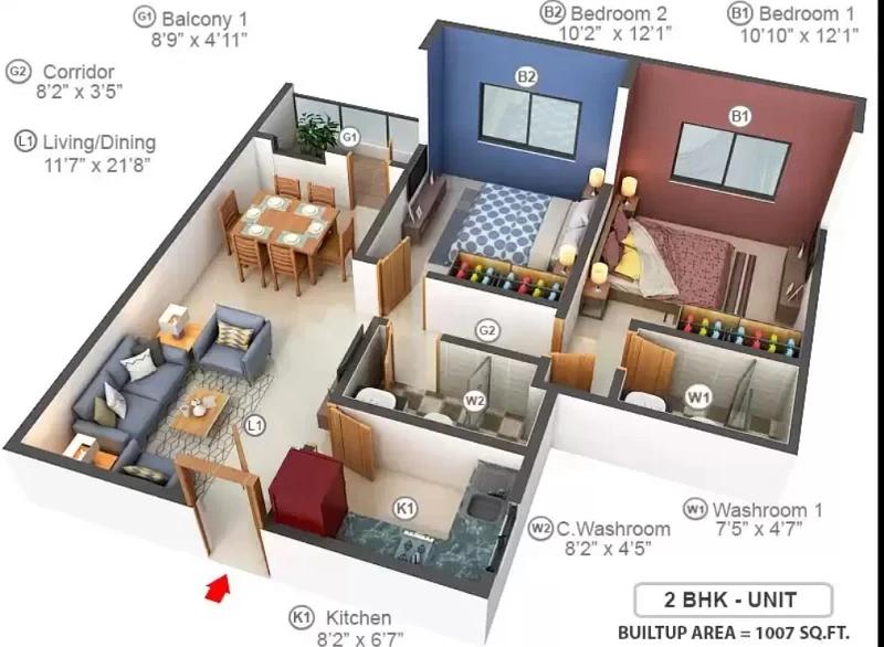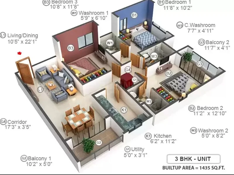 (Super Builtup Area) : 1007 – 1435 sq.ft