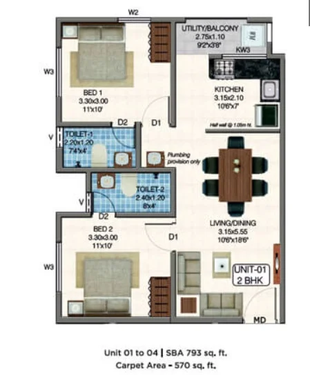 (Super Builtup Area) : 793 – 793 sq.ft