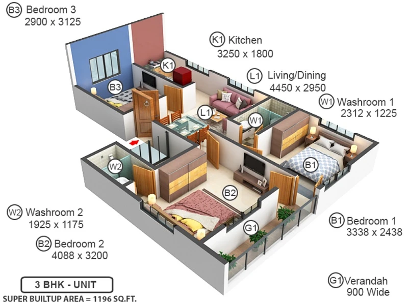 Super Builtup Area : 1196 – 1196 sq.ft