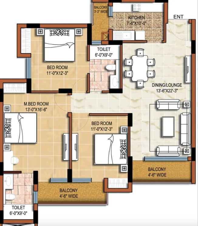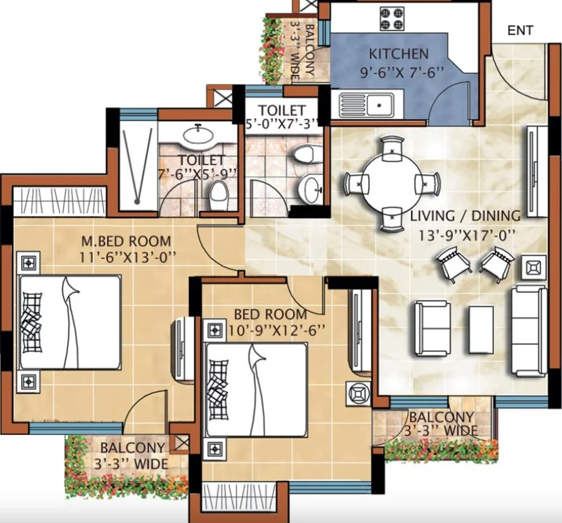 (Super Builtup Area) : 1110 – 1940 sq.ft
