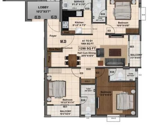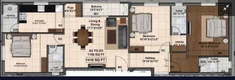 (Super Builtup Area) : 1298 – 1410 sq.ft
