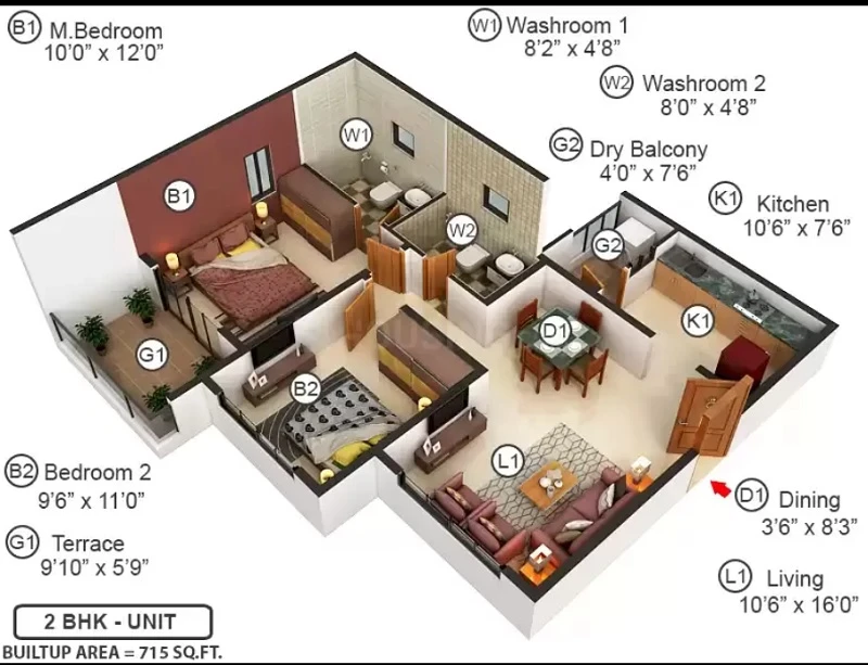 Super Builtup Area : 715 – 715 sq.ft