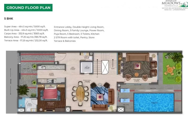 Mahagun Meadow Residential projects in Noida offering Villa for sale in Sector 150. The property offers 5BHK meticulously planned that guarantee a hassle-free lifestyle. As per the area plan, units are in the size range 1425.00 sq.ft. – 2385.00 sq. Ft. The project Mahagun Meadow has 308 Units is ready to move. Mahagun Meadow offers prices suitable for both luxurious and affordable villa in Noida. Mahagun meadow is located Sector 150. The floor plan of Mahagun meadow enables the best utilization of the space with spacious balconies, standard kitchen size and high-quality fixtures. Location advantage of Mahagun Meadow is its proximity to Reputed Schools and Colleges. Unmatched connectivity from all the important landmarks and places. Easy access to everyday utility such as hospitals, schools, supermarts, parks, recreational centers etc. In terms of facilities, Mahagun Meadow is loaded with multiple offerings such as Gymnasium, Power Backup. For families with kids, there is Children Play Area, nearby apart from Swimming Pool. It is a Gated Community. Immerse yourself in a world of sports with provisions for Tennis Court, Basketball court, Badminton Court, Cycling & Jogging Track. Residents can make use of Restaurants/Cafeterias, Internet / Wi-Fi, provisions in the project. There is 24×7 Security. It is one of the most admired residential projects in Noida. Mahagun Group is a conglomerate of Companies operating in residential and commercial Real Estate and hospitality sectors. The group is synonymous with development of icons in its current area of operations in Ghaziabad and Noida regions of NCR and has already delivered approx. 15.76 million sq ft covering the development of approx. 11,500 residential units, besides hotels and commercial spaces. The development of approx. 11.57million sq ft covering about 7,500 units is currently in progress.