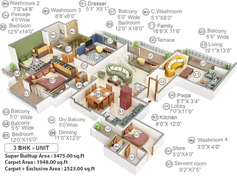 (Super Builtup Area) : 2500 – 4425 sq.ft