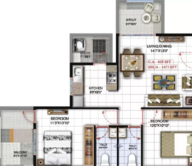 (Super Builtup Area) : 932 – 1844 sq.ft