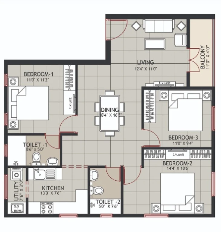 (Super Builtup Area) : 1196 – 1196 sq.ft