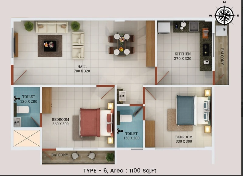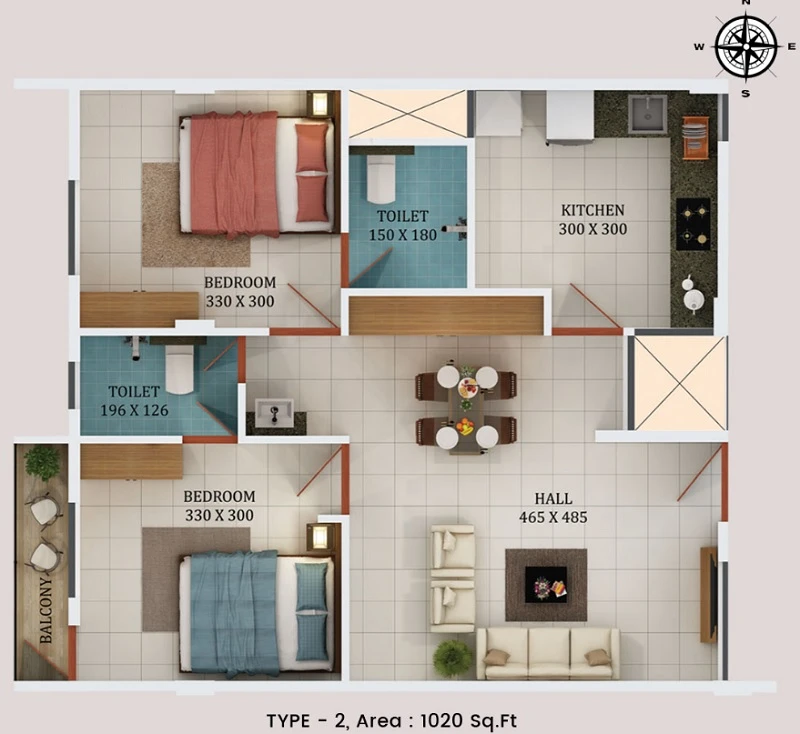 (Super Builtup Area) : 1020 – 1100 sq.ft