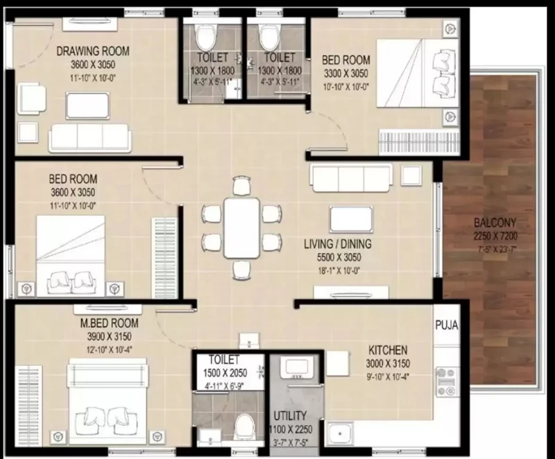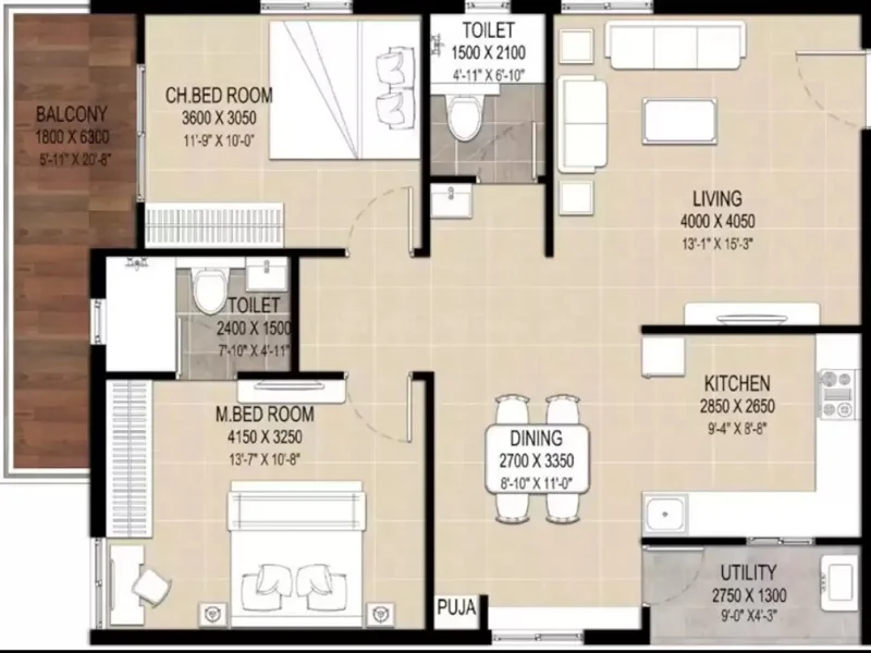 (Super Builtup Area) : 1275 – 1675 sq.ft