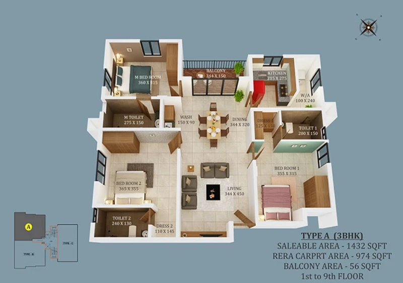 (Super Builtup Area) : 1330 – 1432 sq.ft