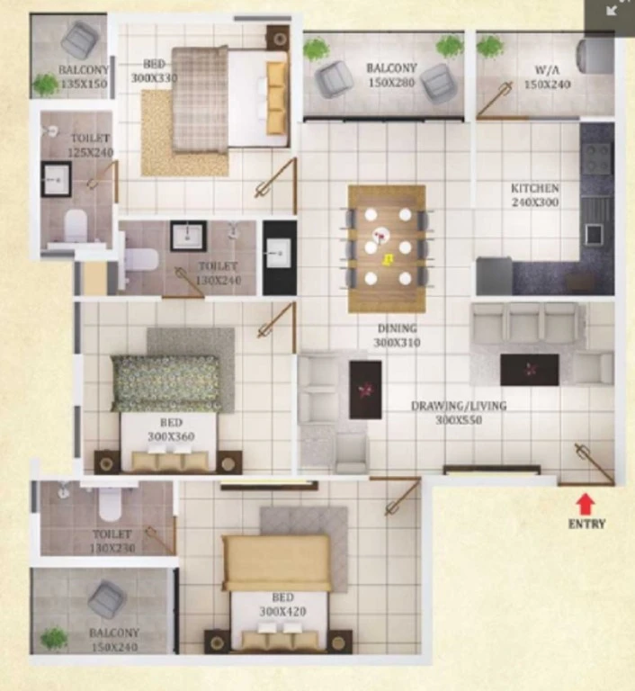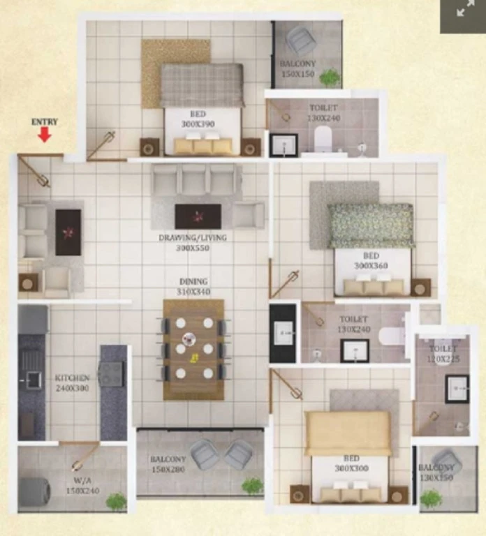 (Super Builtup Area) : 1300 – 1350 sq.ft