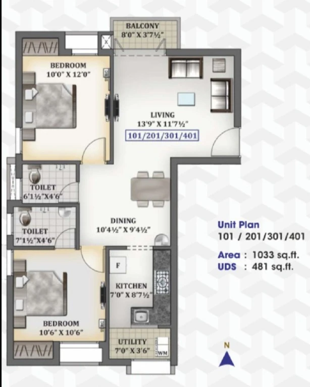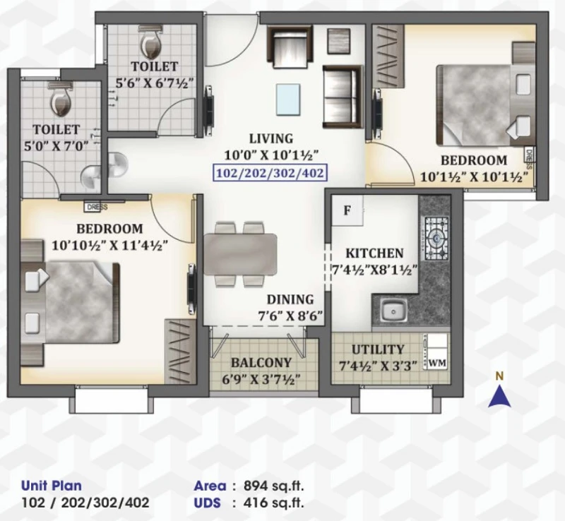 (Super Builtup Area) : 894 – 1033 sq.ft