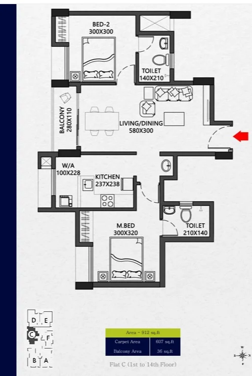 Super Builtup Area : 607 – 840 sq.ft