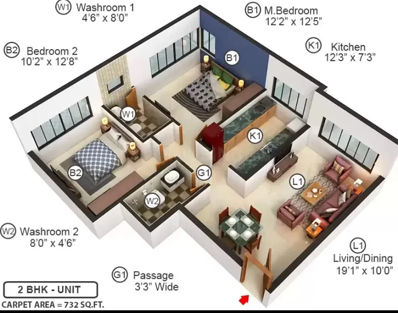 Super Builtup Area : 732 – 1243 sq.ft